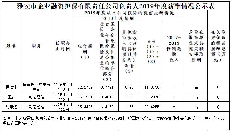 雅安市企業(yè)融資擔(dān)保有限責(zé)任公司負(fù)責(zé)人2019年度薪酬情況公示表